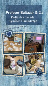 Na satu u školskoj knjižnici učenici su imali priliku doživjeti pravu filmsku avanturu kroz kreativne zadatke. Prva aktivnost bila je izrada jednostavne igračke – thaumtropa, čime su otkrili kako crteži mogu postati “živi”. Dobivši izrezani krug od tvrdog kartona i dvije niti vune, učenici su s jedne strane kartona nacrtali lika profesora Baltazara, dok je na drugoj strani lik profesora Baltazara držao šešir. Nakon što su probušili rupice, provukli vunene niti i zavezali ih, zavrtjeli su igračku i otkrili kako se slike stapaju u jednu kada se brzo vrte. Učenici su s uzbuđenjem promatrali kako se likovi stapaju pred njihovim očima, a svaki zavrtaj donosio im je novi doživljaj pokreta.
