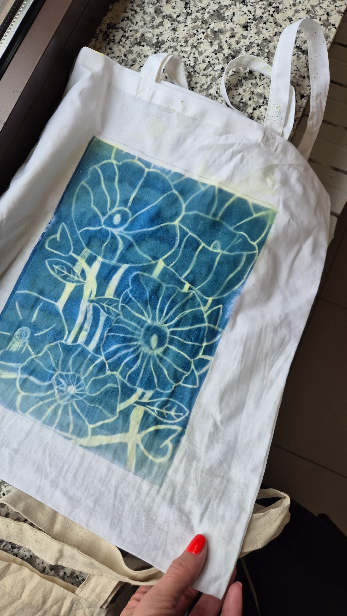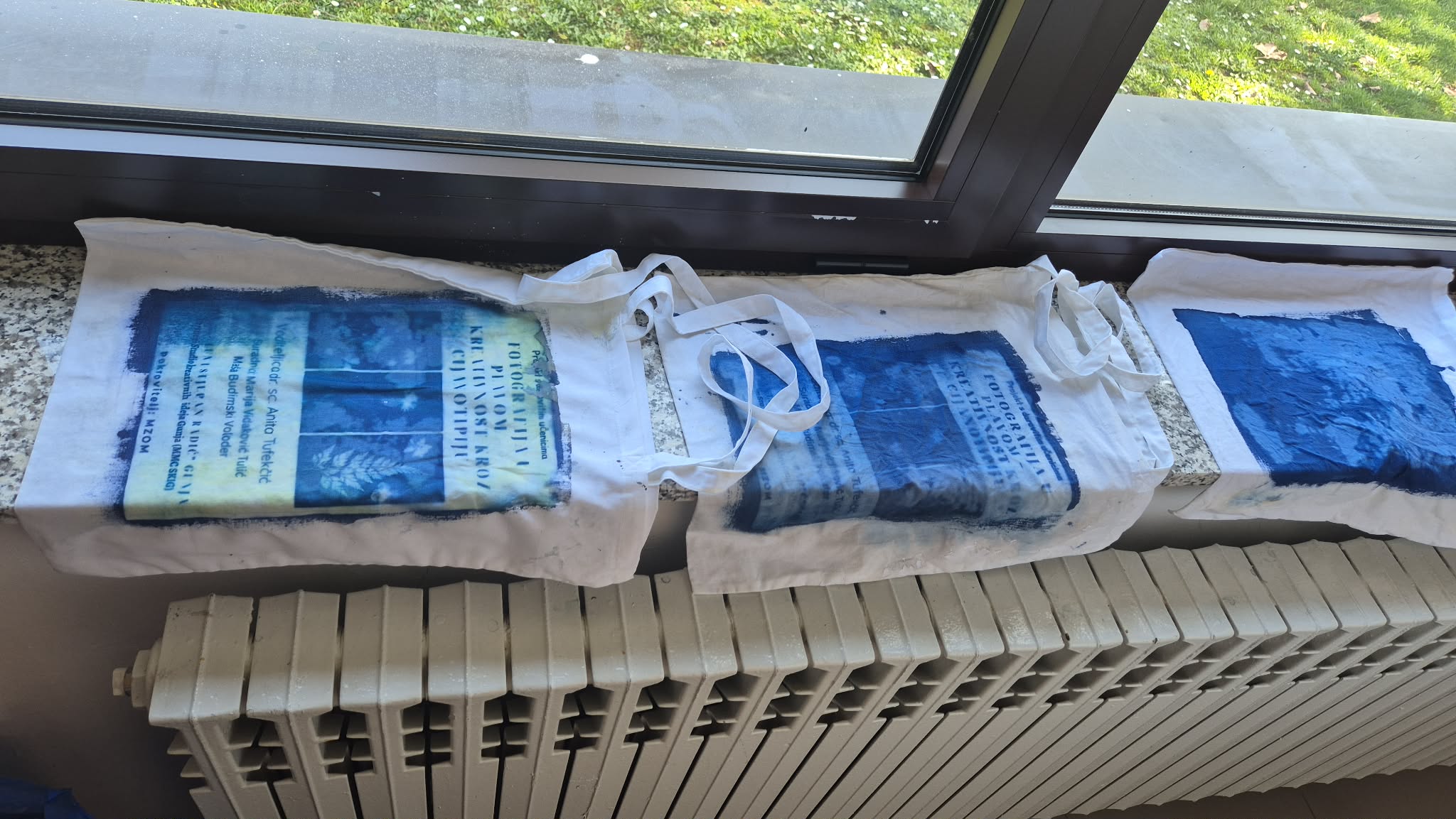 Istovremeno su učenice radile na fotografskom dijelu procesa – pripremi torbi za cijanotipiju. Torbe su premazane fotoosjetljivom otopinom te su, uz pomoć UV lampe, osvijetljeni s motivima cvijeća koje su učenici prethodno pripremili za linorez. Posebno zanimljiv dio procesa bila je priprema i bojanje fotoosjetljivih papira i torbi u uvjetima kontroliranog svjetla. Kako bi se to omogućilo, spremište školske knjižnice pretvoreno je u improviziranu crvenu komoru, odnosno fotografsku tamnu komoru osvijetljenu crvenim svjetlom, u kojoj su učenici mogli sigurno raditi s fotoosjetljivim materijalima i upoznati način rada karakterističan za fotografske laboratorije.