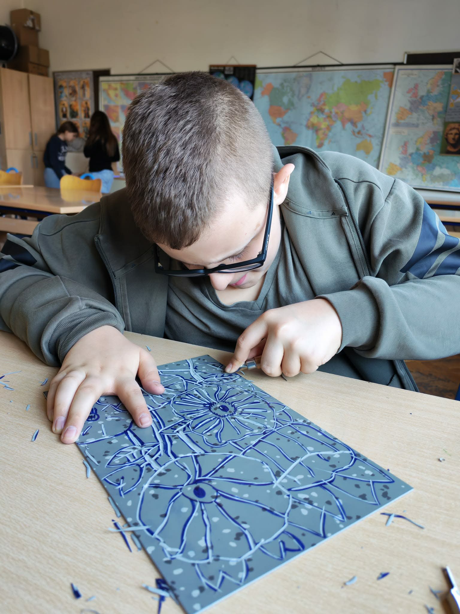 Nakon završetka rezbarenja matrica, učenici su pomoću valjka i boje za linorez otiskivali grafike na već osvijetljene cijanotipijske papire s motivima cvijeća, čime su nastali kreativni radovi koji povezuju fotografiju i grafiku u jedinstvenu umjetničku cjelinu.