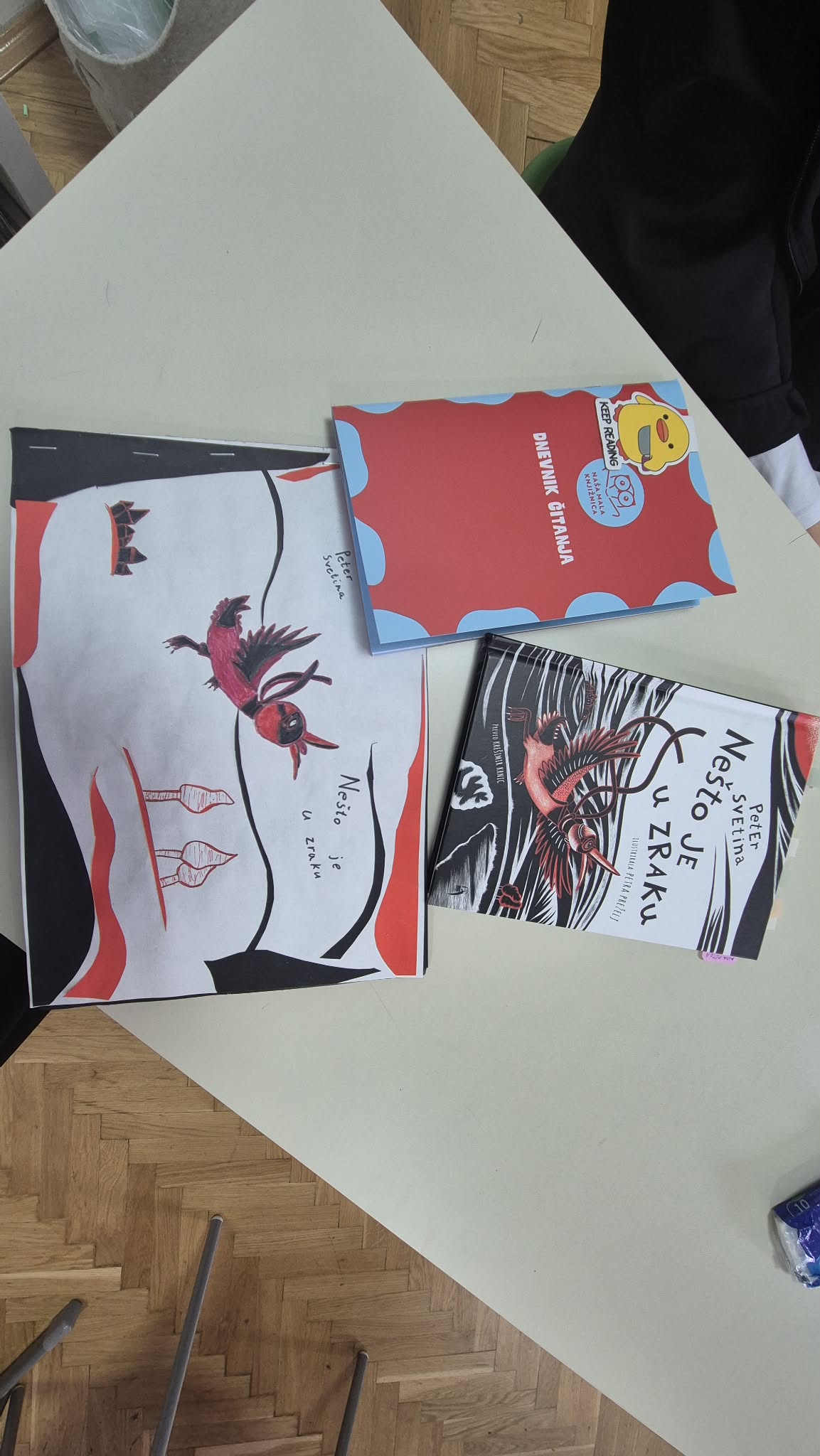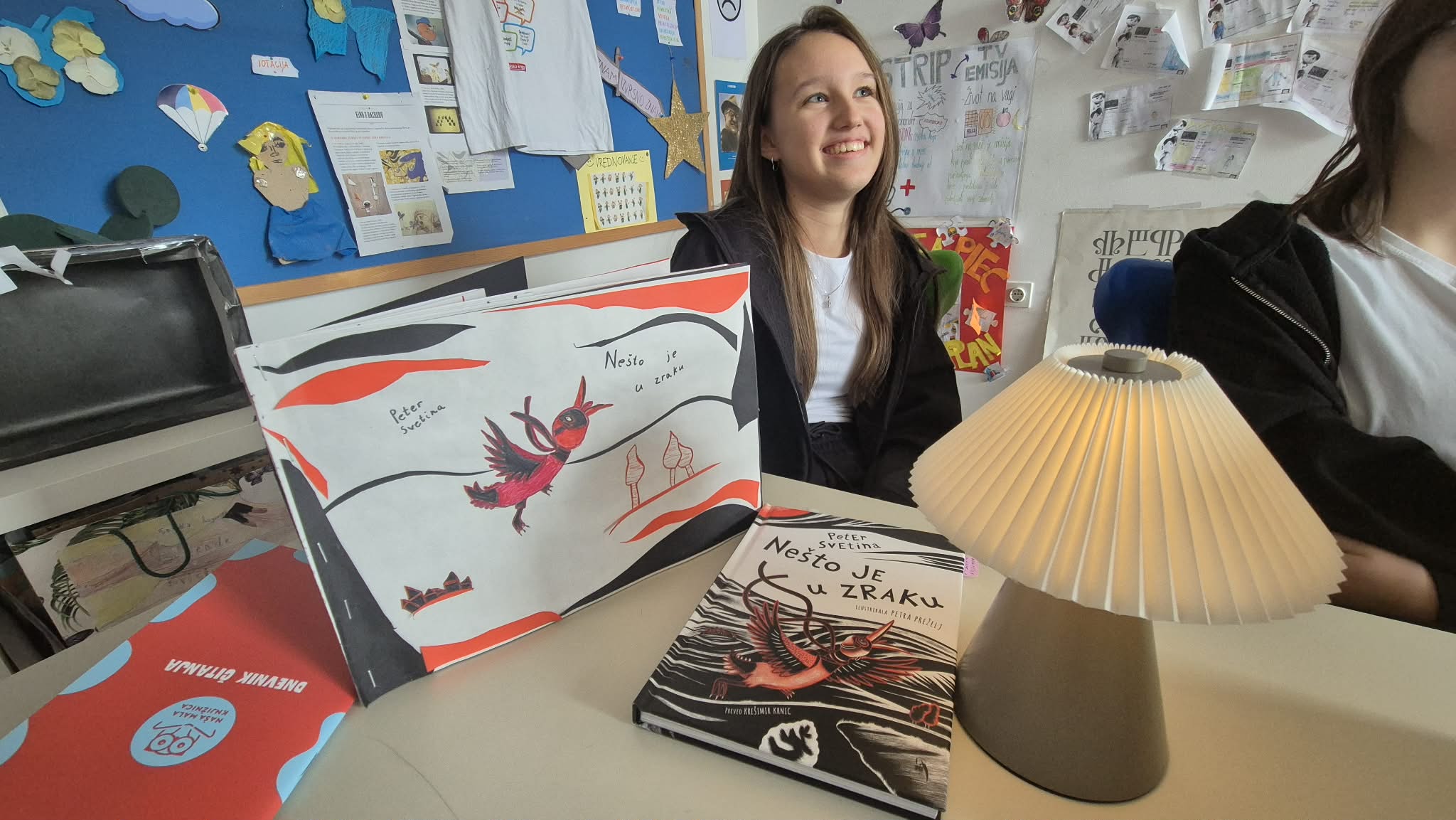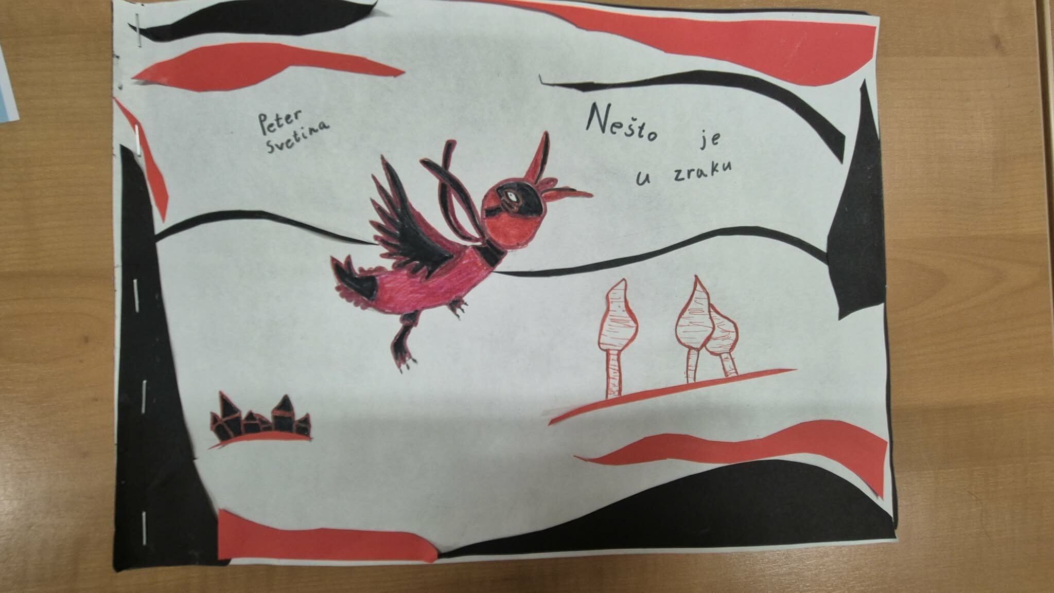 Učenica Dorotea Mrkonjić izradila je mini knjigu u obliku stripa za roman Nešto je u zraku autora Petera Svetine, s ilustracijama Petre Preželj. Priča vodi kroz svijet djevojčice Aide, njezina tate od papira, djeda koji traži zaboravljeni broj, vodenog čovjeka Valdštajna te patka s iznimno oštrim vidom. Riječ je o romanu ispunjenom toplim humorom, osebujnim likovima i maštovitim trenucima.