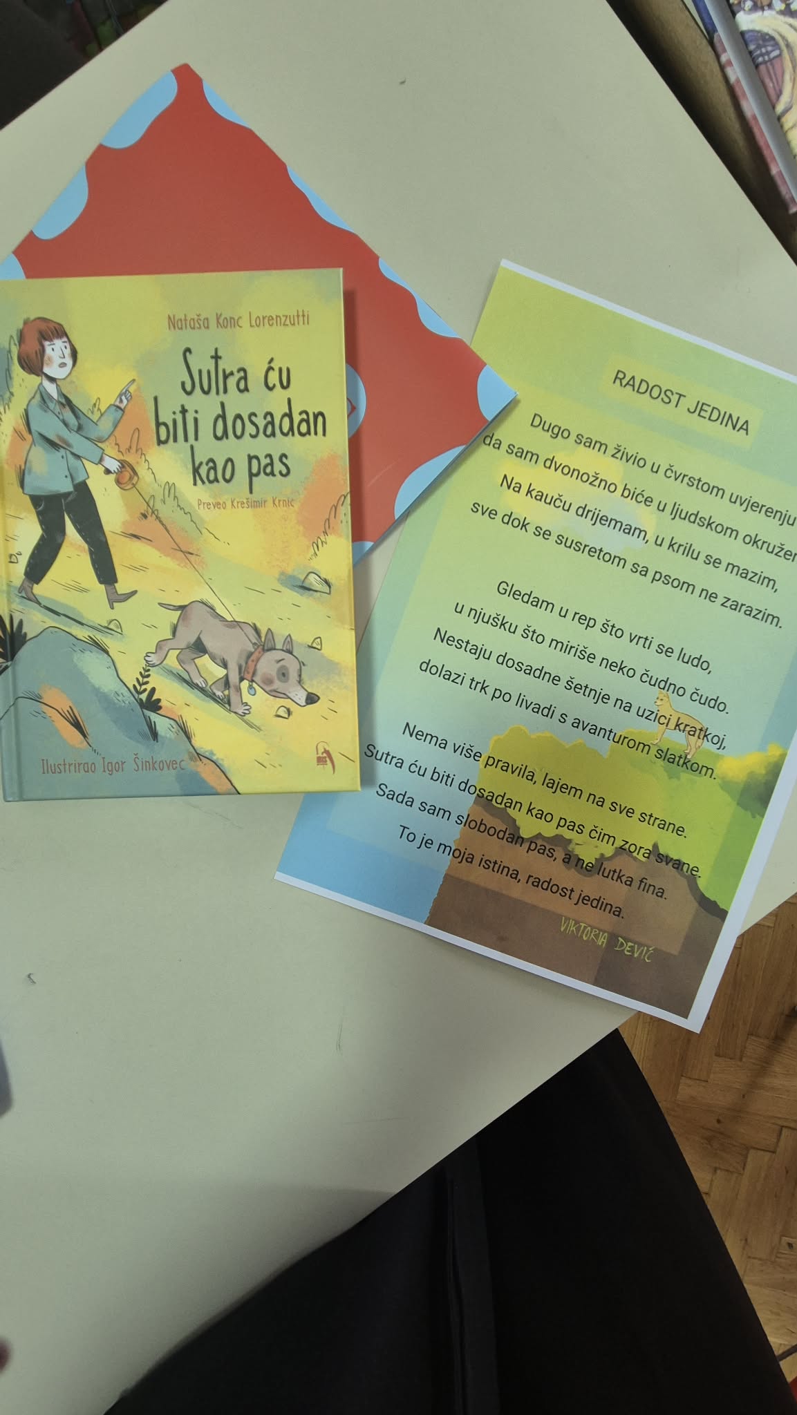 Učenica Viktoria Dević napisala je kratku pjesmu nadahnutu knjigom slovenske autorice Nataše Konc Lorenzutti Sutra ću biti dosadan kao pas, koju je ilustrirao Igor Šinkovec. Roman donosi humorističnu priču o dječaku Akselu koji obožava vremensku prognozu i sanja o tome da postane prognostičar, a neočekivani događaji u parku mijenjaju njegov pogled na svijet.