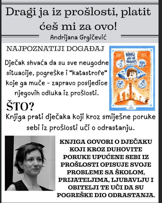 Učenica Mia Garić predstavila je knjigu Andrijane Dragičević Dragi ja iz prošlosti, platit ćeš mi za ovo uz ilustracije Melvina. Riječ je o duhovitoj i neobičnoj priči o dječaku koji piše pisma samome sebi iz prošlosti, pokušavajući promijeniti tijek vlastite povijesti. Uz izlaganje je izradila i dva dojmljiva reklamna plakata.