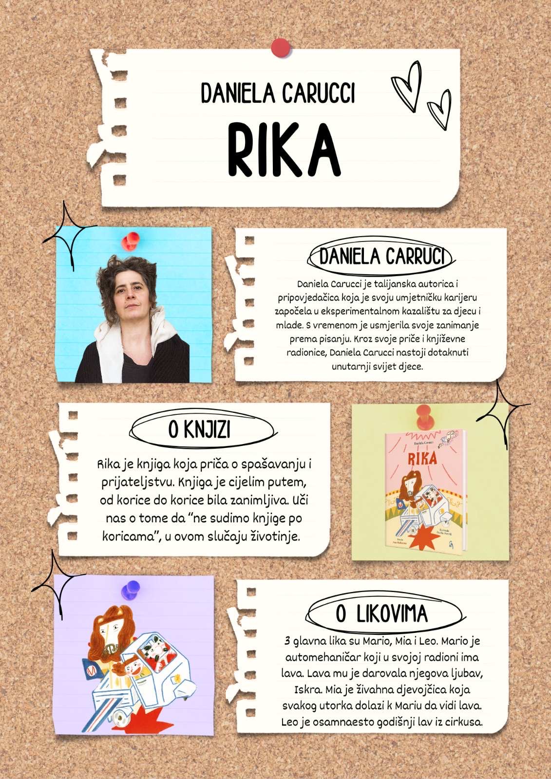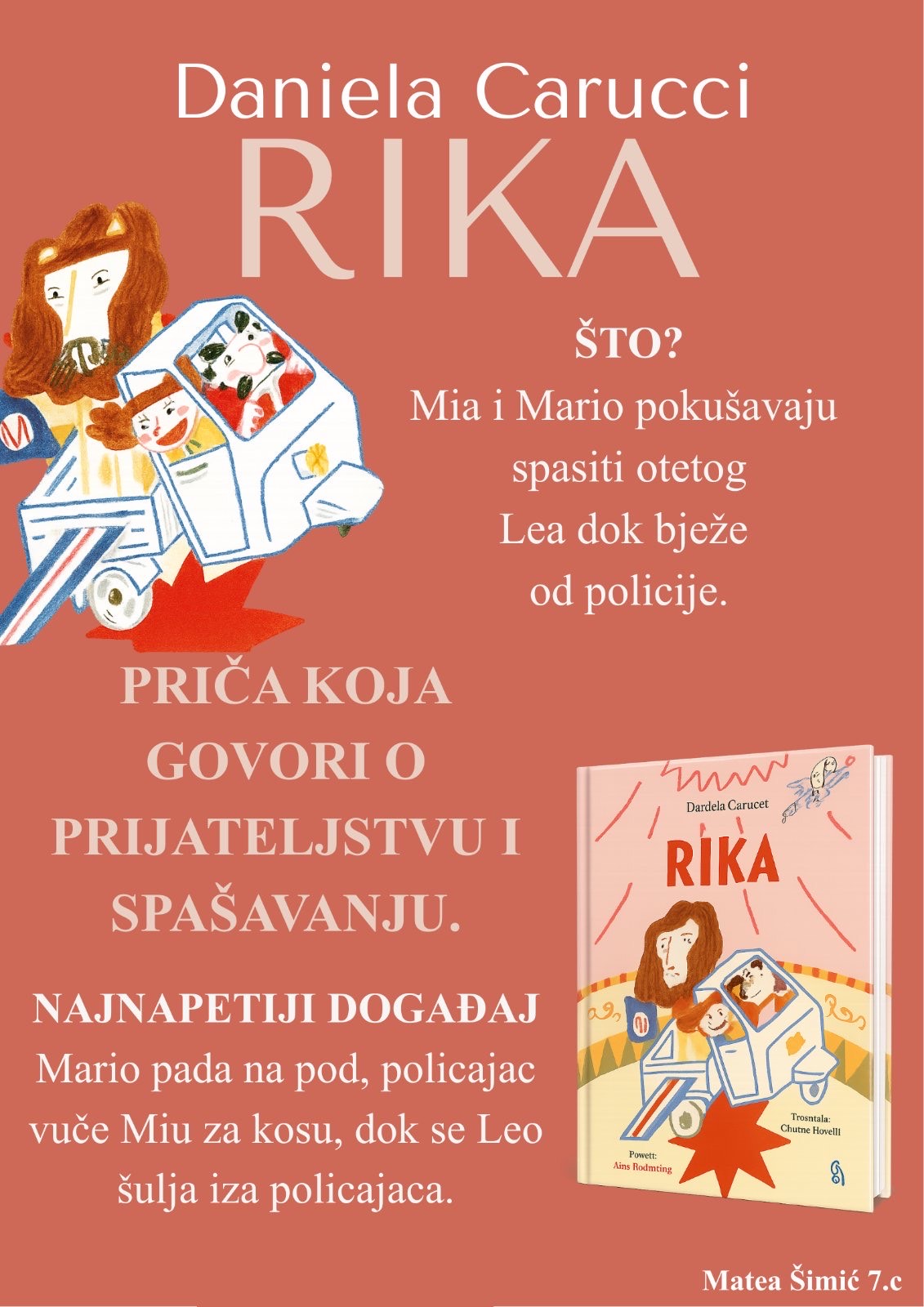 Učenica Matea Šimić izradila je dva iznimno uspješna reklamna plakata za knjigu Rika autorice Daniele Carucci s ilustracijama Giulie Torelli. Roman prati djevojčicu Miju, starog lava Lea, mehaničara i mađioničara Marija, mrzovoljna jazavčara Viktora te tajanstvene zlikovce Plave. Kroz pustolovine, potragu i prerušavanja tematiziraju se prijateljstvo i sloboda.