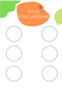 Sljedeća aktivnost uključuje podjelu listića s nazivom “Moje poslijepodne” na kojemu se nalazi 6 krugova. Učenici trebaju nacrtati sve aktivnosti koje mogu raditi u poslijepodnevnim satima, a da ne uključuju digitalne uređaje. Učenike se može potaknuti na razmišljanje pomoću navođenja primjera: igrati skrivača s prijateljima, šetati psa…Nakon što učenici nacrtaju i oboje aktivnosti, pozvati učenike da pojedinačno prezentiraju svoje poslijepodne kroz slike. Svaku nacrtanu aktivnost potrebno je pohvaliti, te motivirati učenika da i dalje sudjeluje u navedenim aktivnostima. Na kraju se učenicima može dati domaći rad pri kojemu trebaju opisati svoje poslijepodne tog dana.