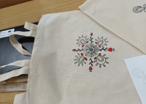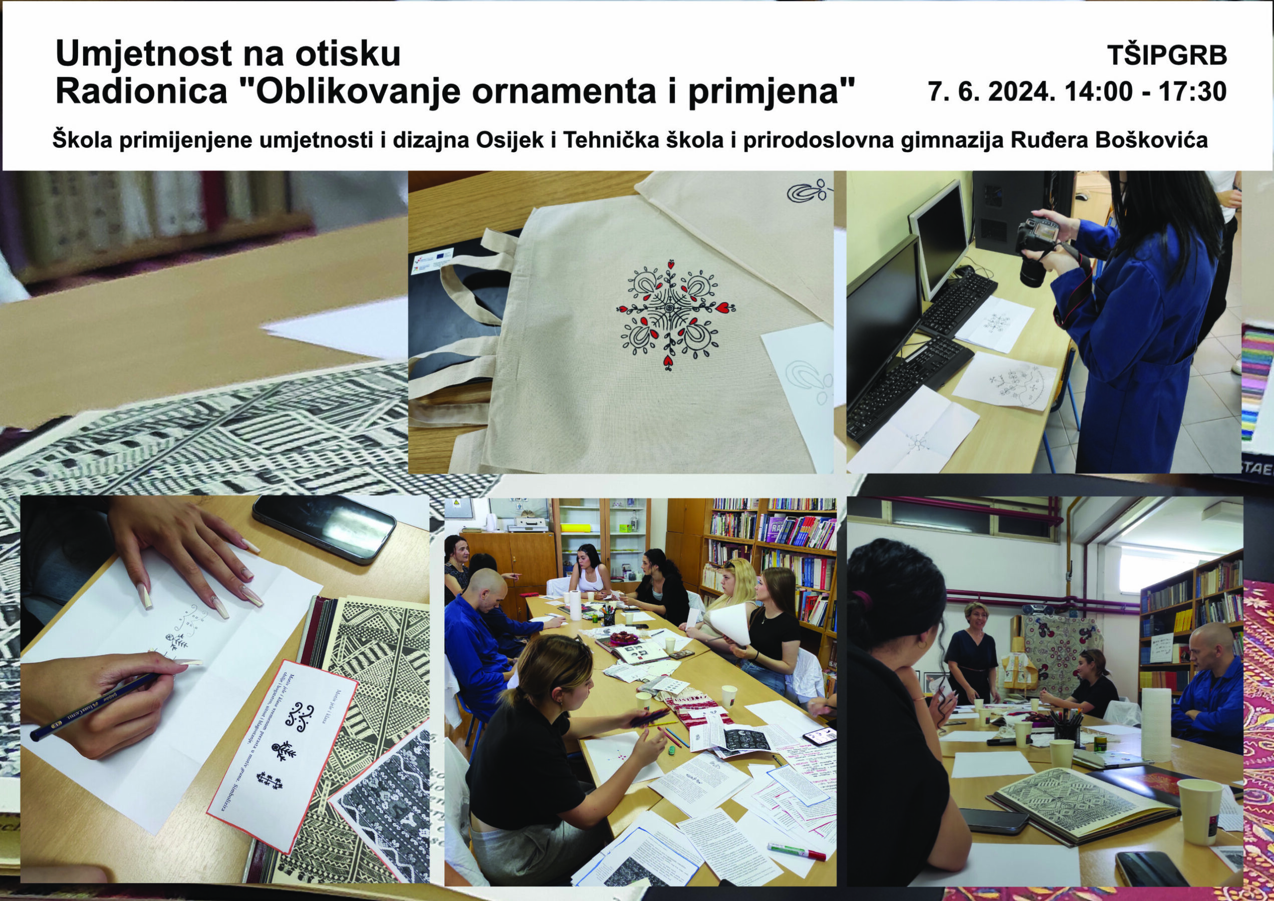 Radionica je osmišljena u sklopu zajedničke suradnje u okviru projekta Umjetnost na otisku. Učenici Lana, Mia, Elizabeta, Iva, Dina, Luka, Antonija i Ela, i njihove nastavnice Goranka Stanić (ŠPUD Osijek), Ozana Vignjević i Mirta Burcar (Ruđerica), imali su priliku upoznati se s tipičnim vizualnim motivima tradicijske kulture, od motiva po obliku do značenja samih motiva, zatim s principima oblikovanja ornamenata, pripremom za tisak, otiskivanjem te s tehnikom sublimacije. Radionica je učenicima omogućila povezivanje umjetnosti s primjenom na konkretnom uporabnom predmetu. Ornamente koje su nacrtali aplicirali smo na torbe. Znanja koja su učenici stekli mogu im pomoći u pokretanju vlastitog posla. Učenici iz umjetničkog područja vidjeli su kako njihovo umjetničko djelo može dobiti još veću vrijednost i primjenu dok su učenici grafičkog smjera razvijali svoje likovne vještine i pomagali gostima u grafičkoj pripremi i tisku. Od literature kojom smo se služili najvrednija bila nam je knjiga Zapisnice, autora Tomislava Livaje.