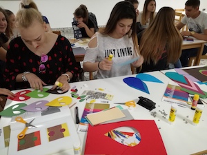 Potom je slijedila radionica u kojoj su učenici, podijeljeni u manje grupe, dobili svoje kreativne zadatke. Po uputama voditeljice i koristeći pripremljene materijale potrebne za njihovu realizaciju, ostvarili su uratke inspirirane djelima naših umjetnika. Svaka je grupa potom predstavila svoj rad. Tako se moglo vidjeti (Richterovu) pokretnu sliku, (Šutejevo) jaje i Mobilnu grafiku, te učenički video uradak po uzoru na Galetove ideje. Sve grupe su ujedno održale kratko izlaganje o umjetniku i njegovom djelu koje im je bilo polazište za rad. Umjetnička ostvarenja i izlaganja komentirao je tročlani učenički žiri. Svi prisutni su se složili da učenici zaslužuju pohvale za svoj trud, kreativno stvaralaštvo te vještinu izlaganja.