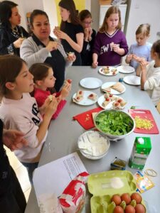 Škola već godinama ima opremljen kabinet za domaćinstvo u kojem učenici kuhaju. Gostima su pripremili i pokazali što znaju. Kuhalo se dva dana, a na meniju su bile zdrave tortilje sa špinatom, varivo od graška, mrkve i piletine s noklicama, kukuruzna zlevanka sa svježim sirom, Kornelijini žganci, kolač od jogurta sa suhim voćem i orašastim plodovima i možda najzanimljivije jelo je bio morski sir koji smo skuhali s litrom Jadranskog mora.