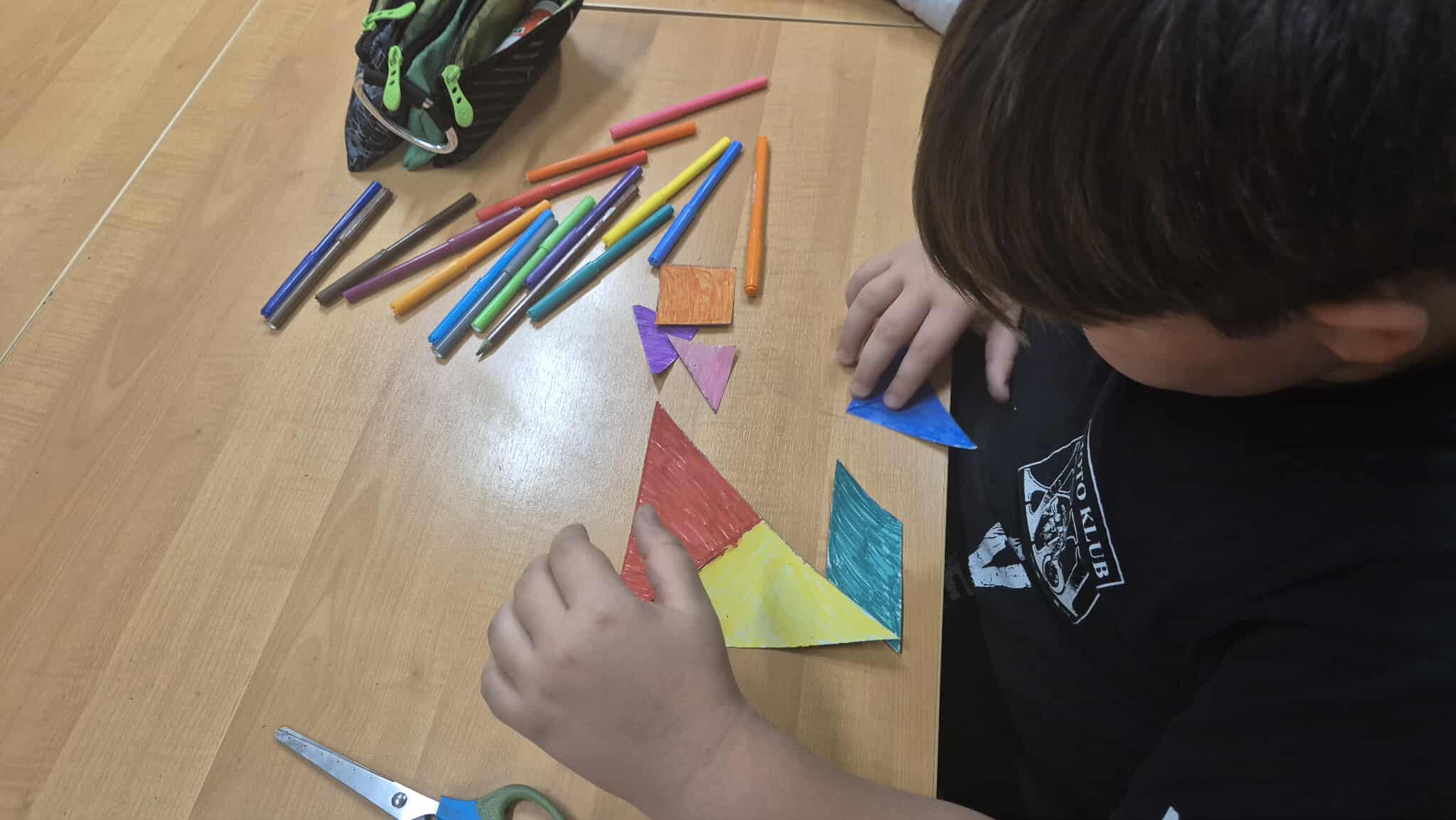 U središnjem dijelu sata učenici dobivaju kvadrat od papira u boji i škarice. Prema uputama školske knjižničarke režu kvadrat na 7 dijelova prema predlošku. Bojanje ili označavanje dijelova (npr. različite boje za različite oblike). Ova faza potiče preciznost, praćenje uputa i razumijevanje geometrijskih pojmova (kut, stranica, oblik).