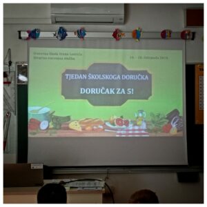 Ovaj tjedan u školi proveden je školski projekt kojim se obilježio Tjedan školskoga doručka 2024. Riječ je o nacionalnom projektu koji za cilj ima podizanje svijesti o važnosti nutritivno bogatoga doručka za svako dijete. Projekt ove godine slavi peti rođendan, a petu godinu zaredom u obilježavanju pridružuje se stručno-razvojna služba škole. U periodu od 14. do 18. listopada za učenike 2. i 3. razreda pripremljene su interaktivne radionice koristeći se informacijama i edukativnim materijalima dostupnim na mrežnoj stranici projekta.