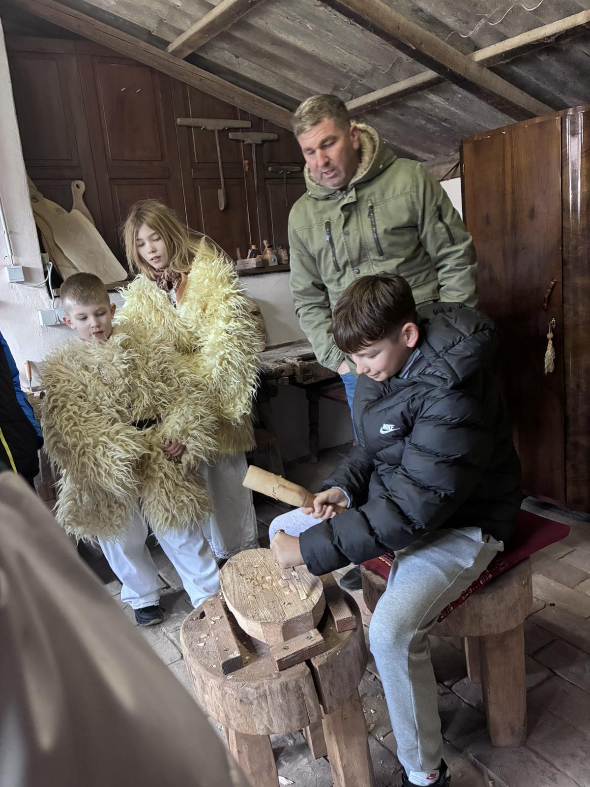 Od majstora su saznali da se maske prave od lipova drveta koji se ne može naći u Baranji kao i od rogova domaćih životinja. Prvo su slušali i vidjeli proces izrade drvene maske. Zatim su sjeli na mjesto majstora te dlijetom probali uz upute izraditi i svoju masku. Posebno je zanimljivo što djeca majstora pohađaju istu školu i rado su svim svojim prijateljima pokazali što rade i koliko je bitno održavati tradiciju u selu jer bez nje sela ne bi ni bilo.