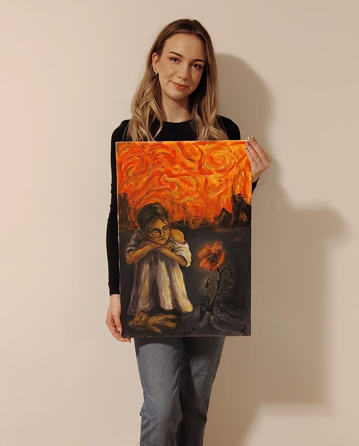 Rad donosi snažnu vizualnu i emocionalnu poruku o posljedicama rata, gubitku djetinjstva i tihoj hrabrosti najmlađih. U središtu kompozicije nalazi se djevojčica obasjana odsjajem plamena koji proždire horizont. Dok odrasli nestaju iz kadra, ostavljajući iza sebe svijet u ruševinama, dijete ostaje samo — suočeno s odgovornošću koju nije biralo. Pored nje leži spaljeni medvjedić, simbol izgubljene nevinosti i djetinjstva koje nestaje u dimu tuđih odluka.