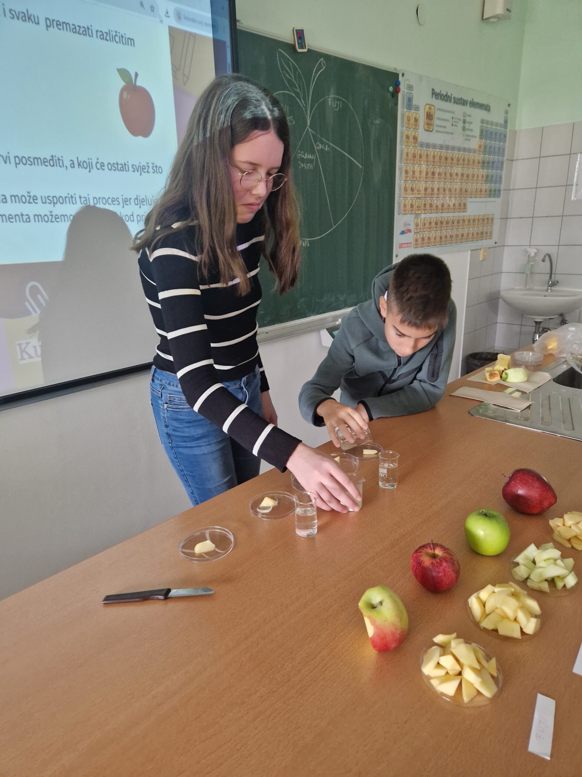 Nakon kušaonice, učenici su proveli istraživački pokus kojim su proučavali proces oksidacije jabuke. Komadiće jabuke su umakali u različite tekućine: vodu, limunov sok, mlijeko i slanu otopinu.