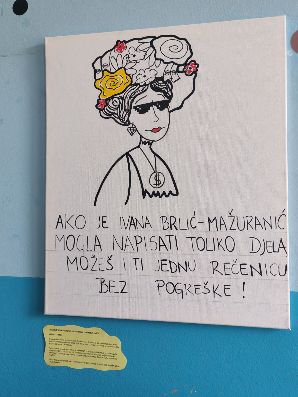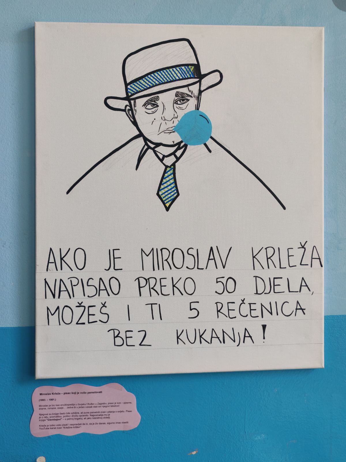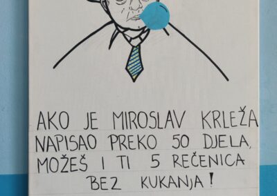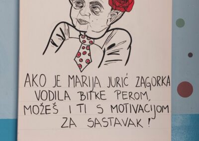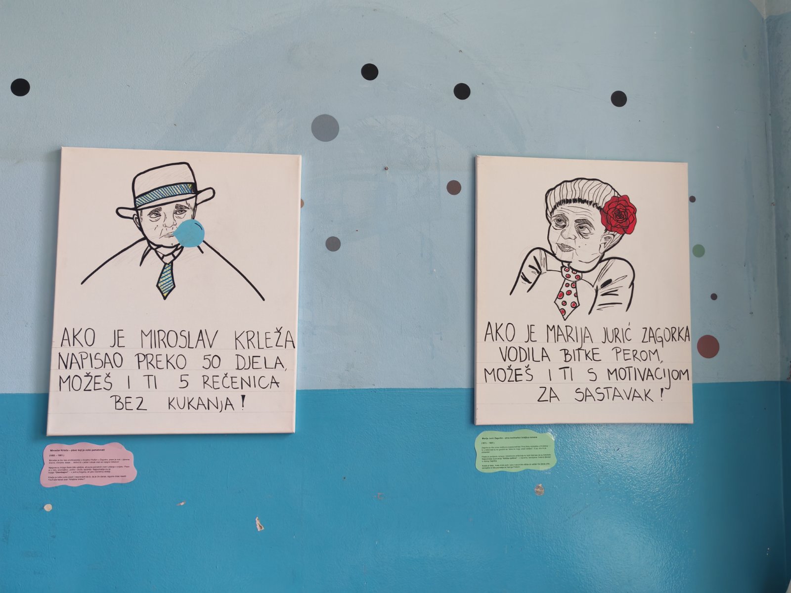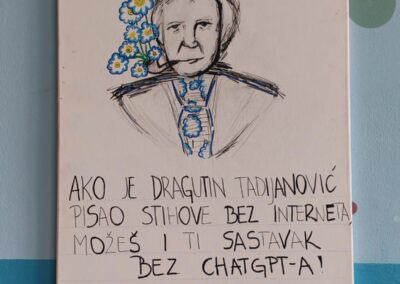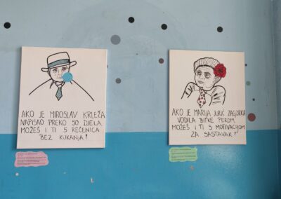 Budući da moje likovne sposobnosti nisu naročito izražene, u pomoć sam pozvala dvije iznimno talentirane učenice – Arin Forjan i Juliju Šolu. Njihove ilustracije oživjele su cijeli projekt. Nisu to klasični portreti pisaca kakve inače viđamo po školskim panoima – htjele smo da budu suvremeni, vizualno zanimljivi i u duhu današnjeg vremena. Tako se, primjerice, Krleža pojavljuje sa žvakaćom gumom, a Ivana Brlić-Mažuranić nosi moderne naočale.