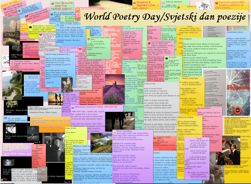 Učenici i nastavnice koristili su novi digitalni alat (Linoit.com) kako bi ljubiteljima poezije predstavili autorske pjesničke radove na hrvatskome i engleskom jeziku, kao i pjesme istaknutih hrvatskih i svjetskih pjesnika. Priloženi su i pažljivo odabran zvučni zapisi antologijskih stihova koji obogaćuju vizualni poetski doživljaj. Prema riječima sudionice ovoga e-događanja Martine Peunić, bivše učenice škole, danas dipl. teologinje i pjesnikinje, „iz šarenila i stihova u digitalnoj riznici pršti pozitiva i ljepota“.