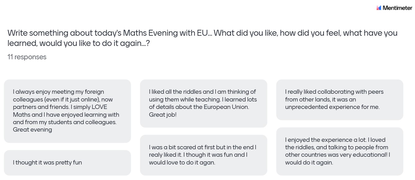 Uslijedio je zaključni dio radionice (19.20 – 19.50) – zajednička analiza rezultata rada učenika i (samo)vrednovanje. Na priloženim fotografijama (izlazne kartice na platformi Mentimeter) može se vidjeti kako učenici (i nastavnici) (pr)ocjenjuju zajedničku radnu “Večer matematike”. Sudionici sastanka uživali su i u glazbi – stihovi prof. Opačak, koji sadrže matematičke simbole i šalju globalnu poruku mira za održivi planet, uglazbljeni su pomoću aplikacije Suno AI (Zero & Infinity – OVDJE i Global Peace – OVDJE). Kao što to inače biva (na nastavi Matematike), učenici su pozvani odraditi domaću zadaću – pokušati oblikovati vlastite stihove i umjetnom inteligencijom generiranu glazbu. Ovoga je puta zadaća bila izborna, a provjerit će ju se – uoči Međunarodnoga dana matematike (14. ožujka 2025.).