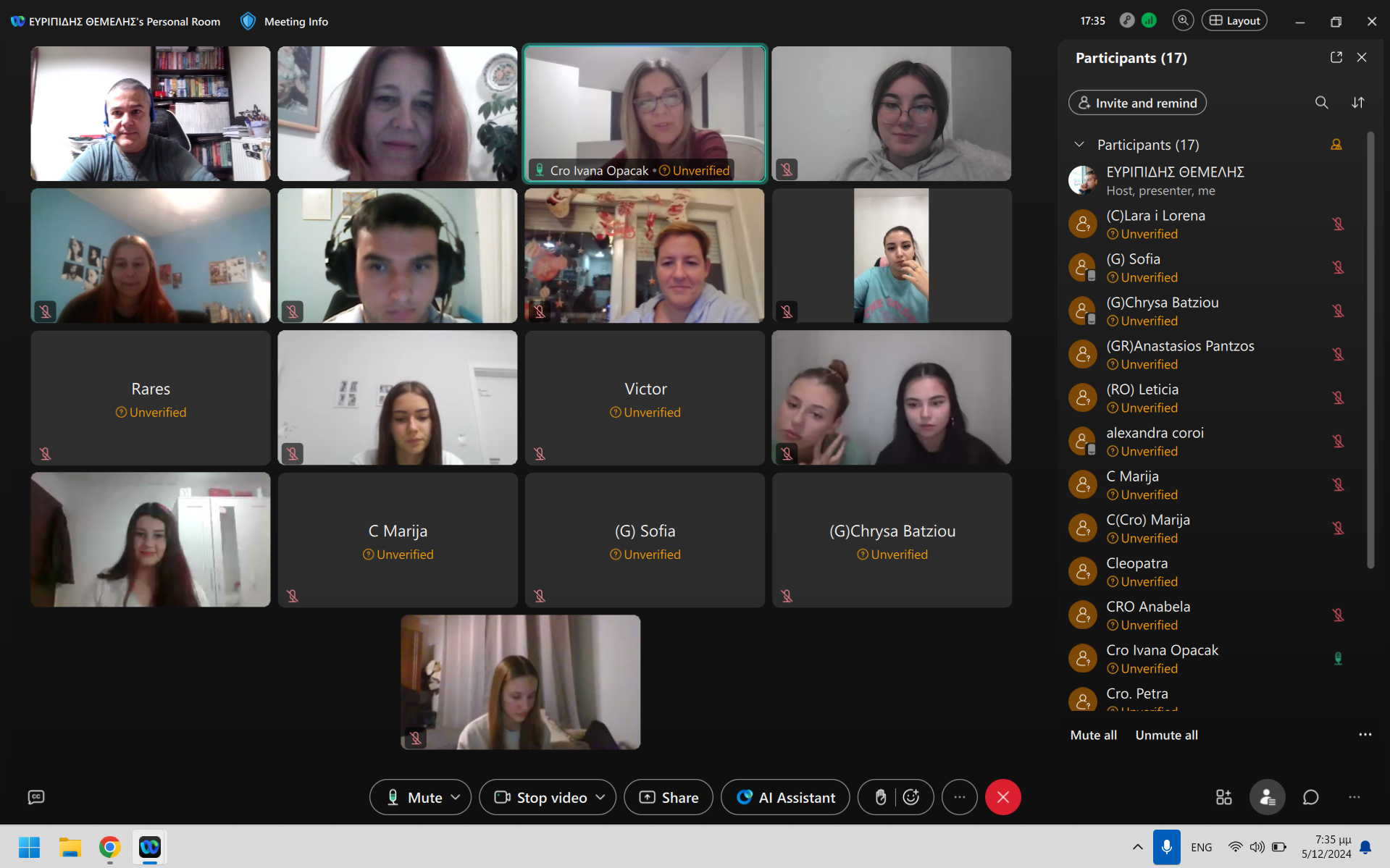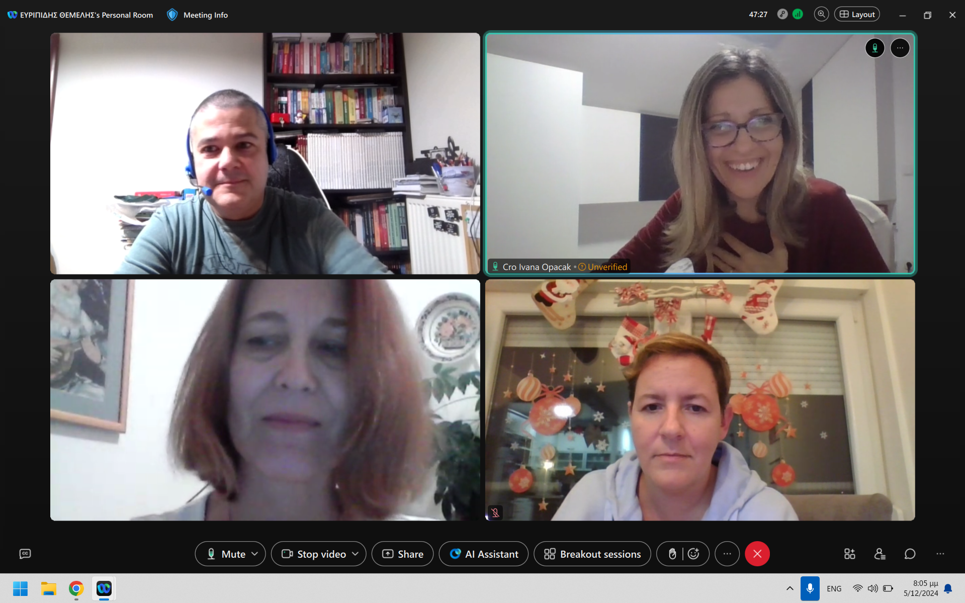 Online radionica “EU in Riddles & Numbers” (na platformi Webex) 5. prosinca 2024. okupila je 15 učenika i četvero nastavnika iz Rumunjske, Grčke i Hrvatske, a moderiralo ju je dvoje nastavnika, autora scenarija učenja. Prof. Opačak moderirala je prvi dio radionice (18.30 – 19.00), u kojemu su učenici odgonetavali jezične zagonetke o simbolima Europske unije, zemljama partnericama u projektnoj suradnji te značajnim europskim znanstvenicima, izumiteljima, umjetnicima… i poznatoj matematičkoj/Arhimedovoj konstanti… Zagonetke su kreirane pomoću alata umjetne inteligencije (ChatGPT i Microsoft Copilot), a ambasadori EP-a triju zemalja pokazali su zavidno znanje.