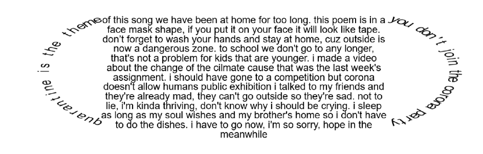 Jedan od takvih zadataka bio je napisati vizualnu pjesmu na engleskom jeziku. Učenici su dobili upute i primjere te kratak film s pojašnjenjem pojma vizualne umjetnosti, odnosno vizualne poezije. Zadano je bilo izraziti se o tome kako je jednom četrnaestogodišnjaku biti izoliran od većine ljudi i događaja u svakodnevnom životu. Alati za izradu pjesme nisu bili zadani, ali su bili predloženi. Pisanje poezije jedna je od složenijih jezičnih djelatnosti i uključuje brojne jezične funkcije među kojima su najistaknutije poetska i emotivna. Stoga je ovaj zadatak predstavljao učenicima izazov na više razina – jezičnoj, emotivnoj, grafičkoj i digitalnoj. Jedan od reprezentativnih radova izradila je učenica 8b razreda. Koristeći se Wordom, Power Pointom te alatom za savijanje teksta koji se zove TroyGram, oblikovala je svoju pjesmu kao zaštitnu masku za lice.