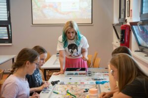 Također, u školi je održana radionica bojenja minijatura – minifigura za društvene igre u kojoj su sudjelovali zainteresirani učenici od drugog do sedmog razreda. Minifigure, poput Warhammer figura, često su dio društvenih igara, a dizajneri ih koriste kako bi igre učinili vizualno privlačnijima i lako prepoznatljivima. Figure uz igre obično dolaze neobojene kako bi se svim kreativcima pružila prilika da ih uz nekoliko jednostavnih tehnika i malo boje učine unikatnima i prilagode ih vlastitom ukusu. Upravo je zbog toga hobiju igranja društvenih igara srodan hobi bojenja minijatura za igre s kojim su se učenici upoznali na radionici. Radionicu je vodio suradnik u projektu Marin Domjanović koji je u našoj školi gostovao i ranije predstavljajući razne moderne društvene igre i uvodeći učenike u njihove raznolike svjetove. Učenicima je na taj način pružena mogućnost učenja osnovnih tehnika bojenja te stvaranja vlastitoga seta figura. Zadatak im je bio slijediti intuiciju i emocije te napraviti jedinstven proizvod. Pritom su se upoznali s osnovnim tehnikama bojenja, miješanjem boja, sjenčanjem, naglašavanjem detalja. Koristeći akrilne boje namijenjene bojenju figura, upoznali su se s odgovarajućem konzistencijom boje, načinima pravilnoga nanošenja boje, čestim pogreškama i načinima kako ih izbjeći. Zainteresiranost naših učenika za ovaj hobi privukao je interes i svjetski poznatog proizvođača boja i figura koji je školi donirao veliku količinu materijala te je u sklopu projekta u planu ovu priču nastaviti dodatnom naprednom radionicom bojenja te radionicom za početnike.